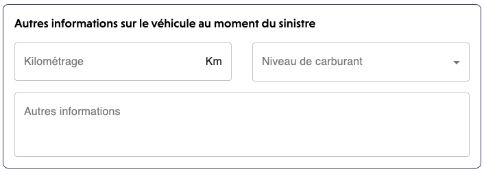 Renseignez ici le kilométrage et le niveau de carburant au moment du sinistre. Vous pouvez également renseigner un commentaire si besoin dans l'encart "autres informations".