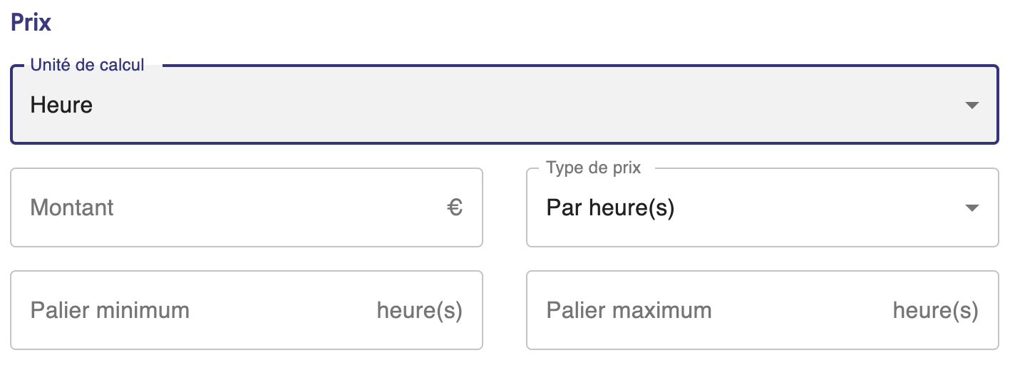 Entrez le montant et le type de prix (prix fixe ou prix par unité). Des paliers s'afficheront pour paramétrer le calcul à effectuer.