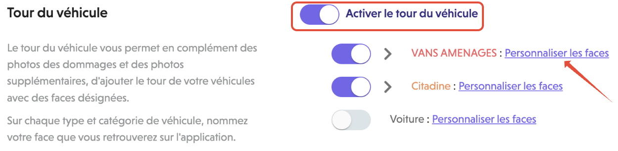 Chemin d'accès : Admin > Réglages > Fleetee Check > Tour de véhicule