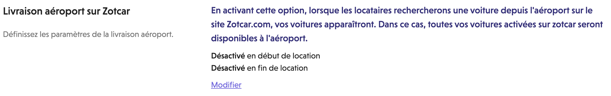 Par la suite, rendez-vous dans Admin > réglages > paramètres de réservation > livraison aéroport sur Zotcar pour déterminer les surplus tarifaire.