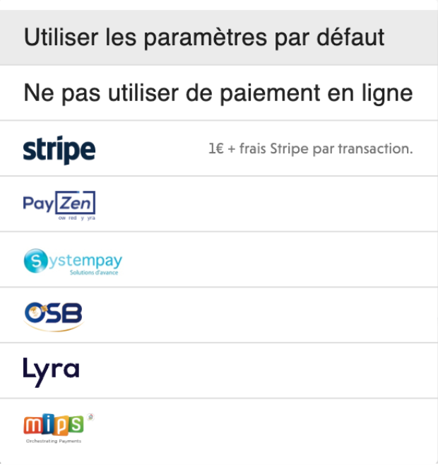 - Choisir le paiement en ligne qui lui convient parmi le choix proposé (Stripe, Payzen, Systempay, OSB, Lyra, Mips)