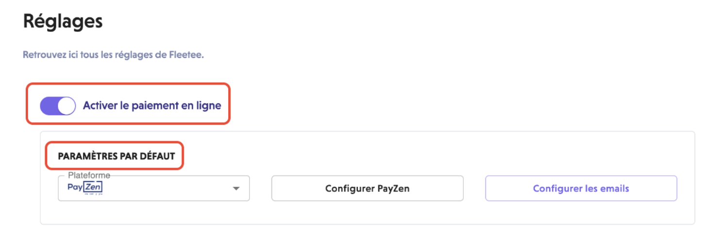 Vous pourrez, sur cette page, activer le paiement en ligne et choisir la plateforme de paiement par défaut pour toute la session Fleetee Manager.